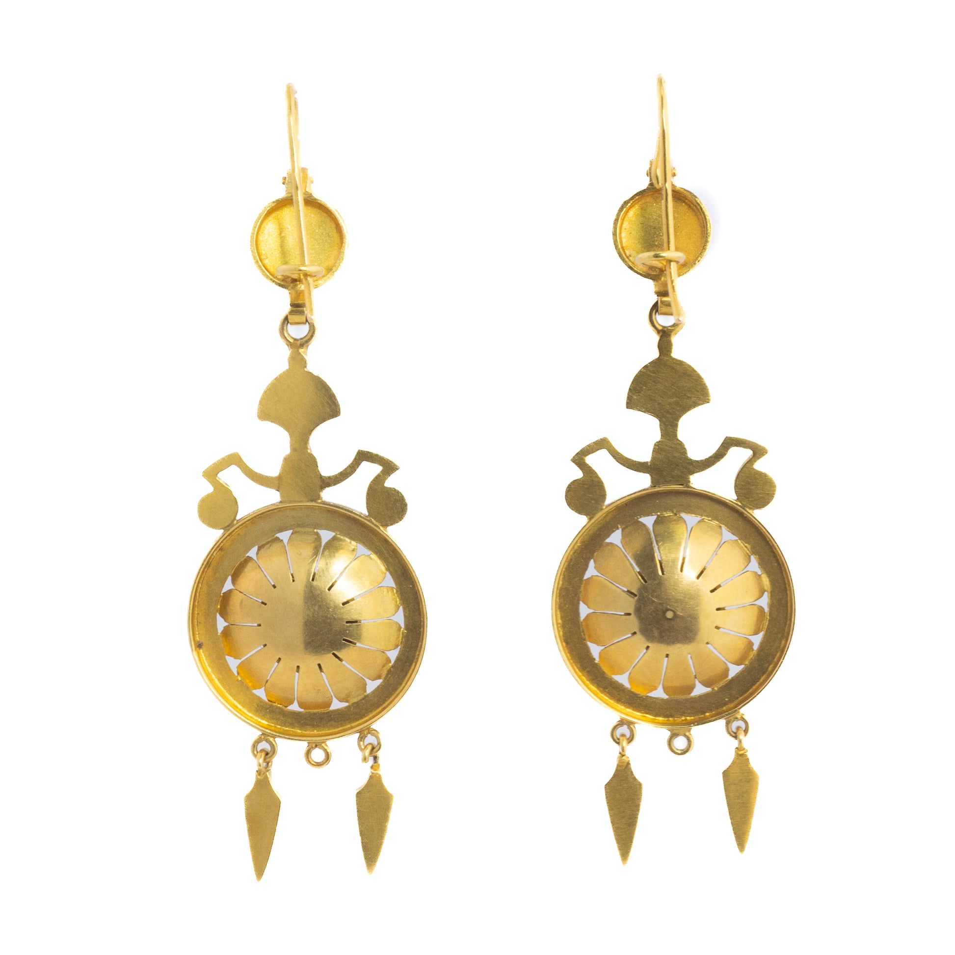 A striking pair of antique-style earrings crafted in 18 karat gold, designed in the Etruscan Revival taste. Each earring features a circular rosette with radiating petal motifs, richly detailed with granulation and textured goldwork. Decorative scroll elements and fan-shaped details accent the upper portion, while three cone-shaped pendants add movement and balance to the design. With their intricate workmanship and warm gold patina, these earrings embody the grandeur and artistry of 19th-century revival jewels.