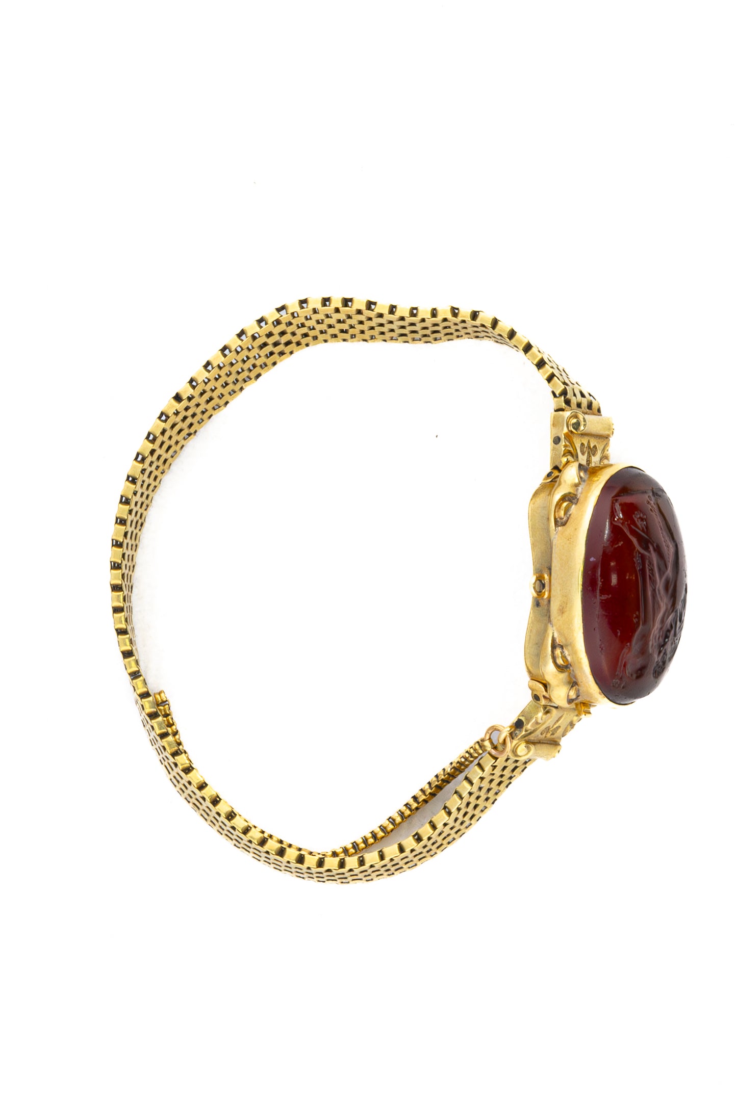 A remarkable antique bracelet featuring a richly hued carnelian intaglio depicting a classical scene, likely mythological, framed in a finely crafted 18 karat yellow gold setting. The deep reddish-brown carnelian is masterfully engraved and bezel-set within an ornate gold surround adorned with delicate scrollwork. The bracelet itself is composed of a flexible woven gold mesh, giving it both structure and fluidity, and closes with a beautifully integrated clasp and safety chain. An elegant relic of refined artistry, this bracelet captures the grandeur of 19th century design with a quiet, noble grace.