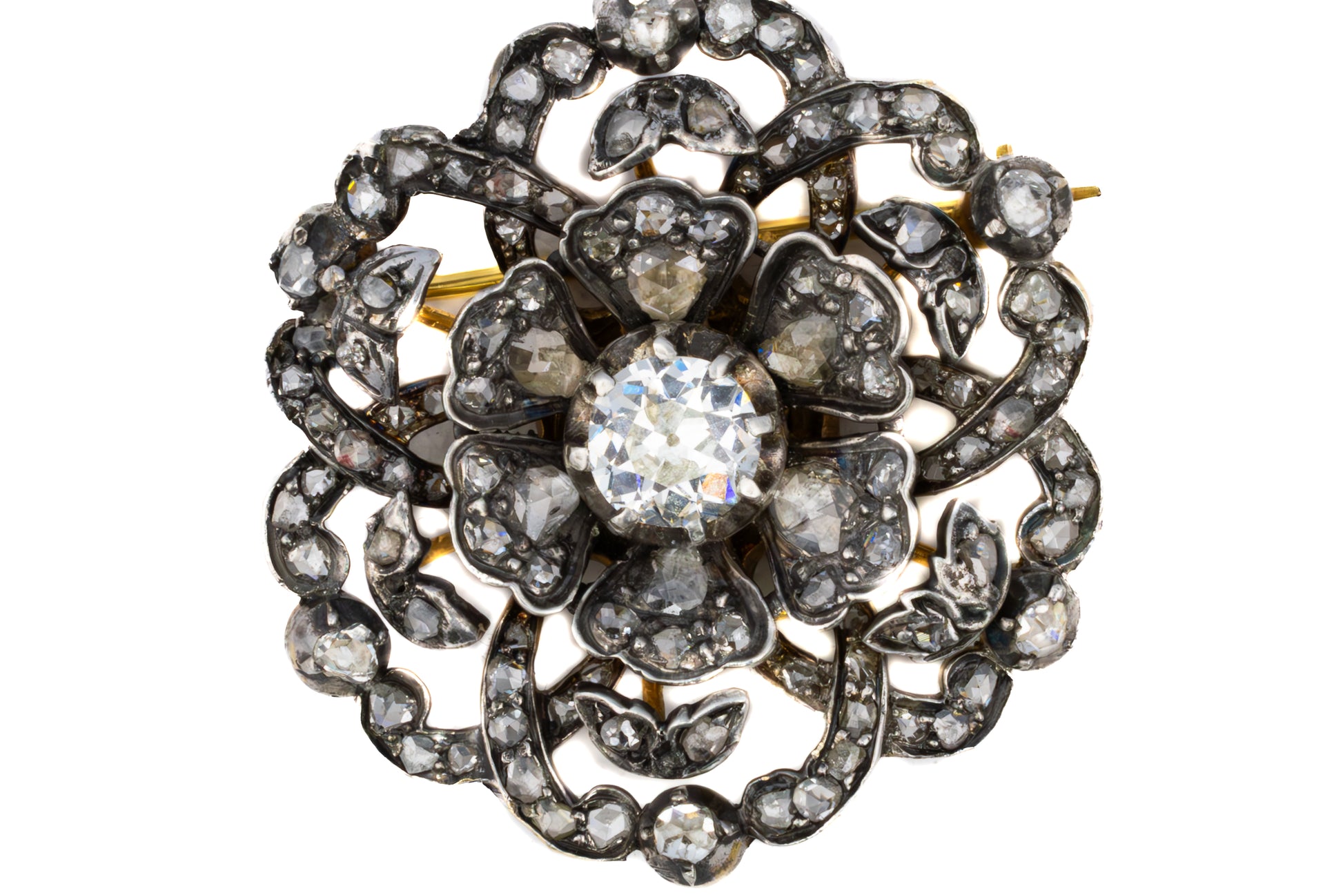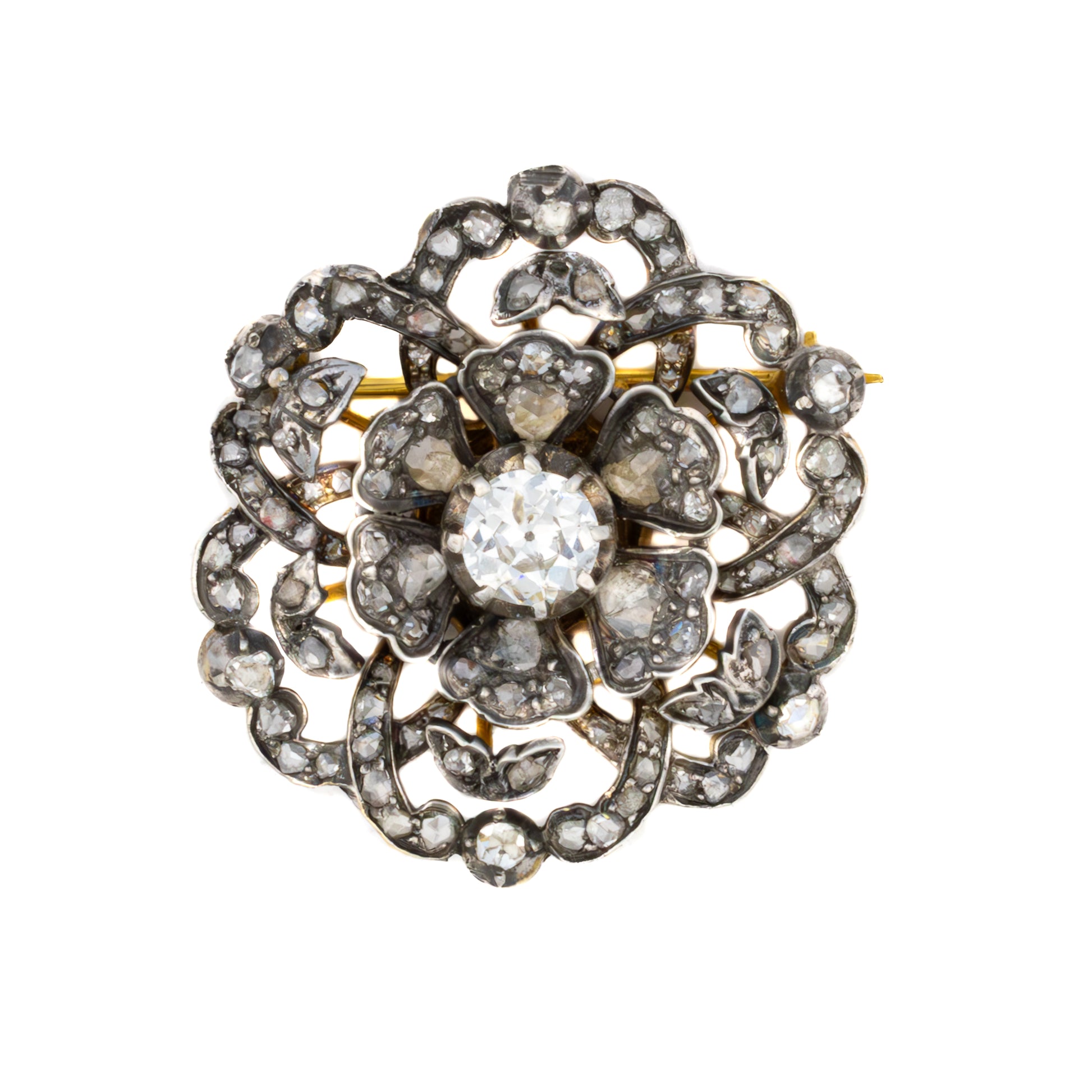 This captivating antique brooch is a romantic floral composition crafted in silver-topped gold, radiating the delicate intricacy of 19th-century design. At the heart of the piece lies a luminous old mine-cut diamond, surrounded by heart-shaped and foliate petals set with rose-cut diamonds, all nestled into darkened silver to heighten their brilliance. The openwork floral motif evokes the organic elegance of Victorian craftsmanship, while the detailed metalwork on the reverse shows its handcrafted origins. A beautiful example of period jewelry that merges artistry with sentiment, this piece exudes historical charm and enduring refinement.