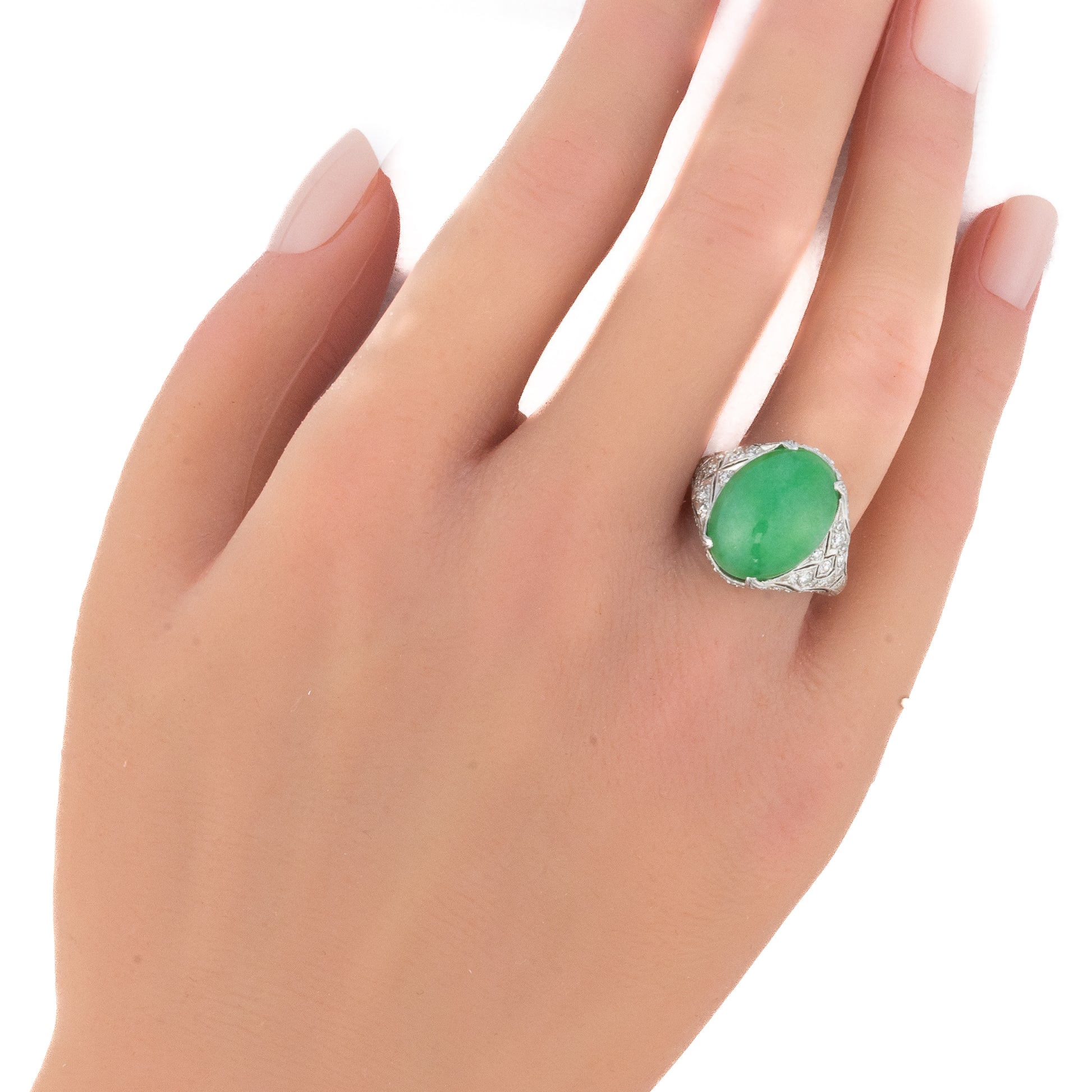 An elegant ring centering on a richly colored jade cabochon of vibrant green, mounted in an ornate platinum setting. The jade is framed by finely detailed openwork shoulders, accented with small diamonds that add a subtle brilliance to the overall design. The platinum mounting showcases delicate engraving and filigree, enhancing the antique character of the piece. A refined jewel that combines the luminous beauty of jade with the timeless sparkle of diamonds, this ring carries both sophistication and vintage charm.