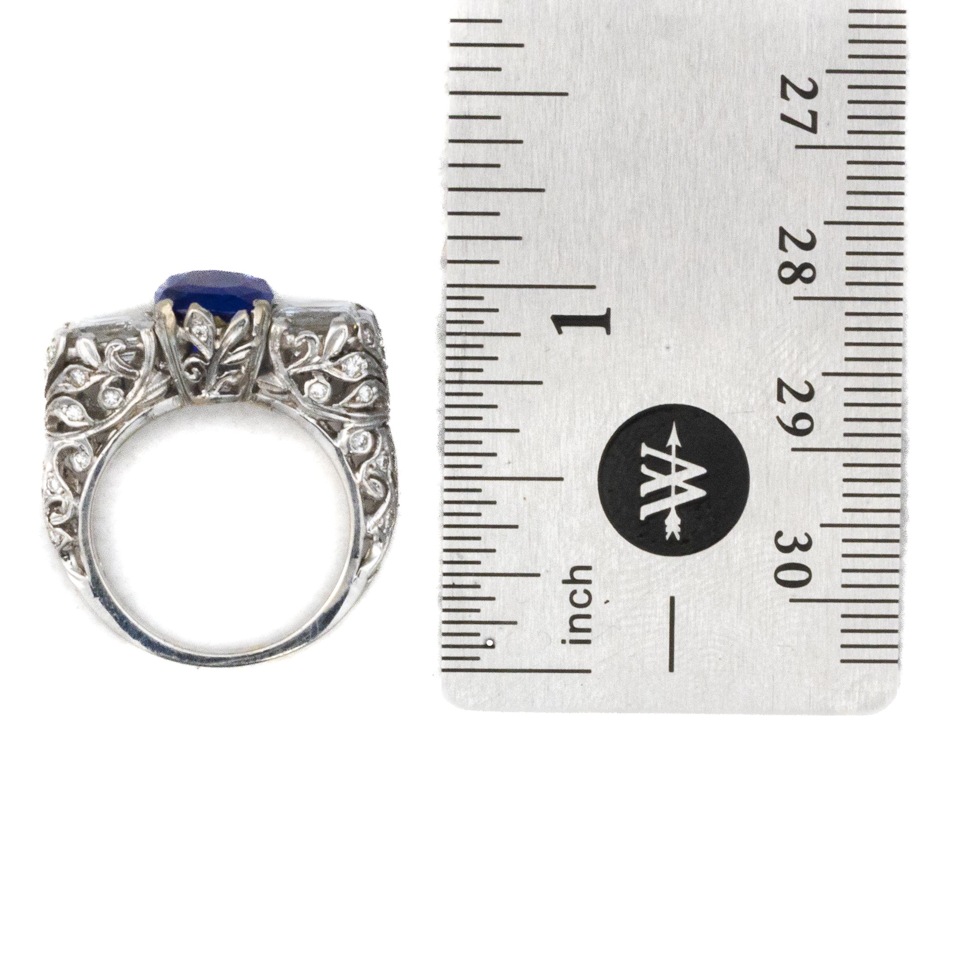 Description: A stunning Art Deco ring crafted in platinum, featuring a vibrant oval-cut Ceylon no heat sapphire weighing approximately 3.72 carats. The deep blue center stone is flanked by two square Asscher diamonds totaling about 0.80 carats, set in a finely detailed mount characteristic of the 1920s. Elegant and timeless, this ring captures the bold geometry and refined craftsmanship of the Art Deco period.