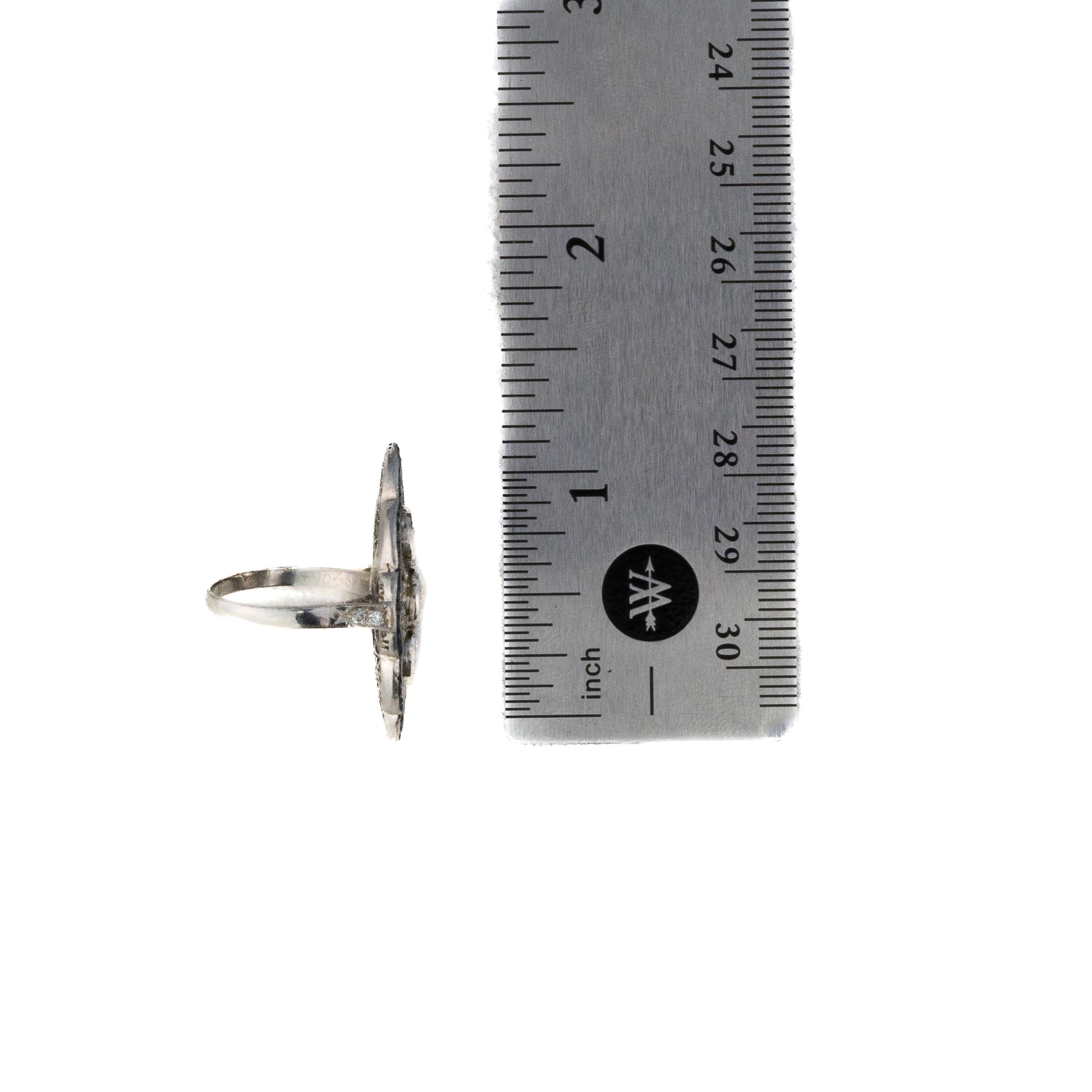 Description: This striking 18k white gold ring showcases a classic navette silhouette centered by three vertically set round diamonds, each framed in smooth bezels that highlight their brightness. Surrounding them is a glimmering field of pavé diamonds that adds depth and richness, all bordered by a vivid line of princess-cut sapphires that creates a bold contrast and defines the elegant elongated shape. The combination of crisp geometry, layered sparkle, and deep blue accents gives this ring a refined Art Deco–inspired presence with strong visual impact.