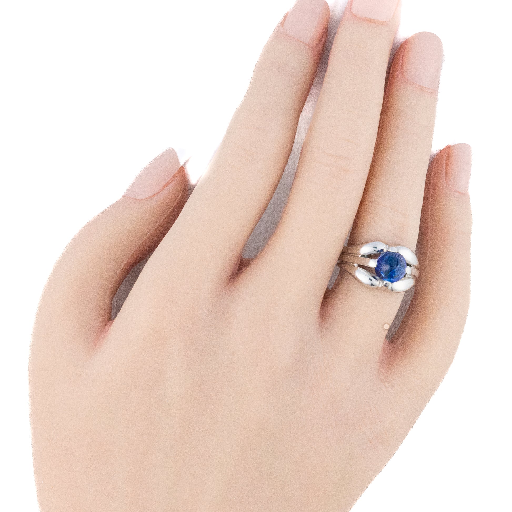 A bold yet refined design, this ring features a deep blue cabochon sapphire mounted in 14 karat white gold. The smooth cabochon cut emphasizes the natural richness of the sapphire’s color, while the sculptural gold mounting adds a modernist touch with clean, architectural lines. Elegant in its simplicity yet striking in presence, this piece is ideal as a signature ring for daily wear or as a standout addition to any fine jewelry collection.