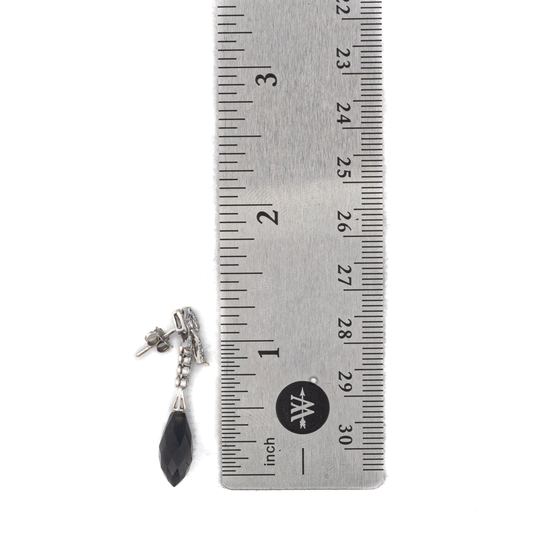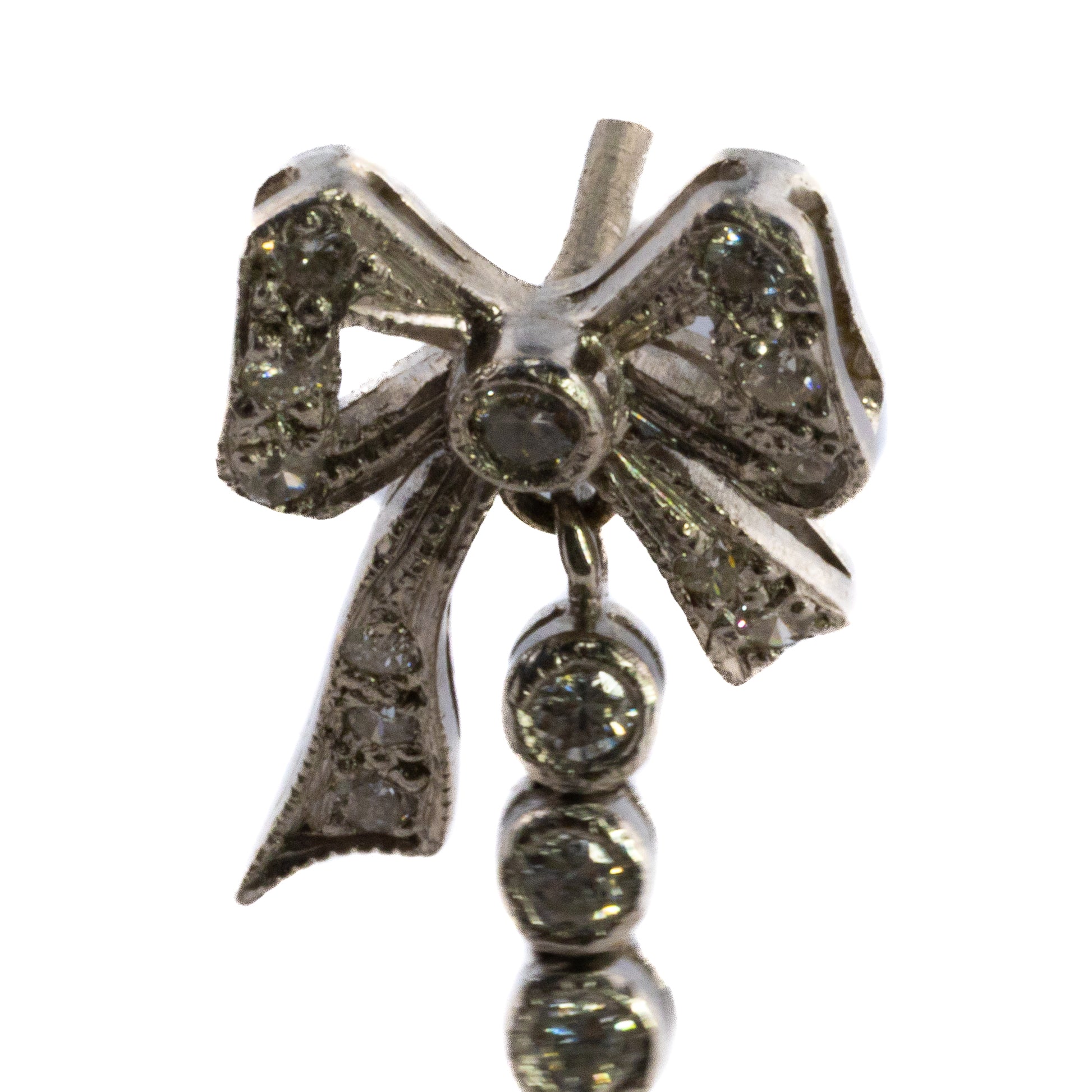 A refined pair of earrings featuring a charming bow motif set with sparkling diamonds, suspending a line of bezel-set diamonds that lead to faceted onyx drops. The contrast between the glittering white diamonds and the deep black onyx creates an elegant and timeless monochrome effect. Designed with graceful movement and delicate detailing, these earrings capture a sense of vintage-inspired sophistication, making them perfect for evening wear or formal occasions.