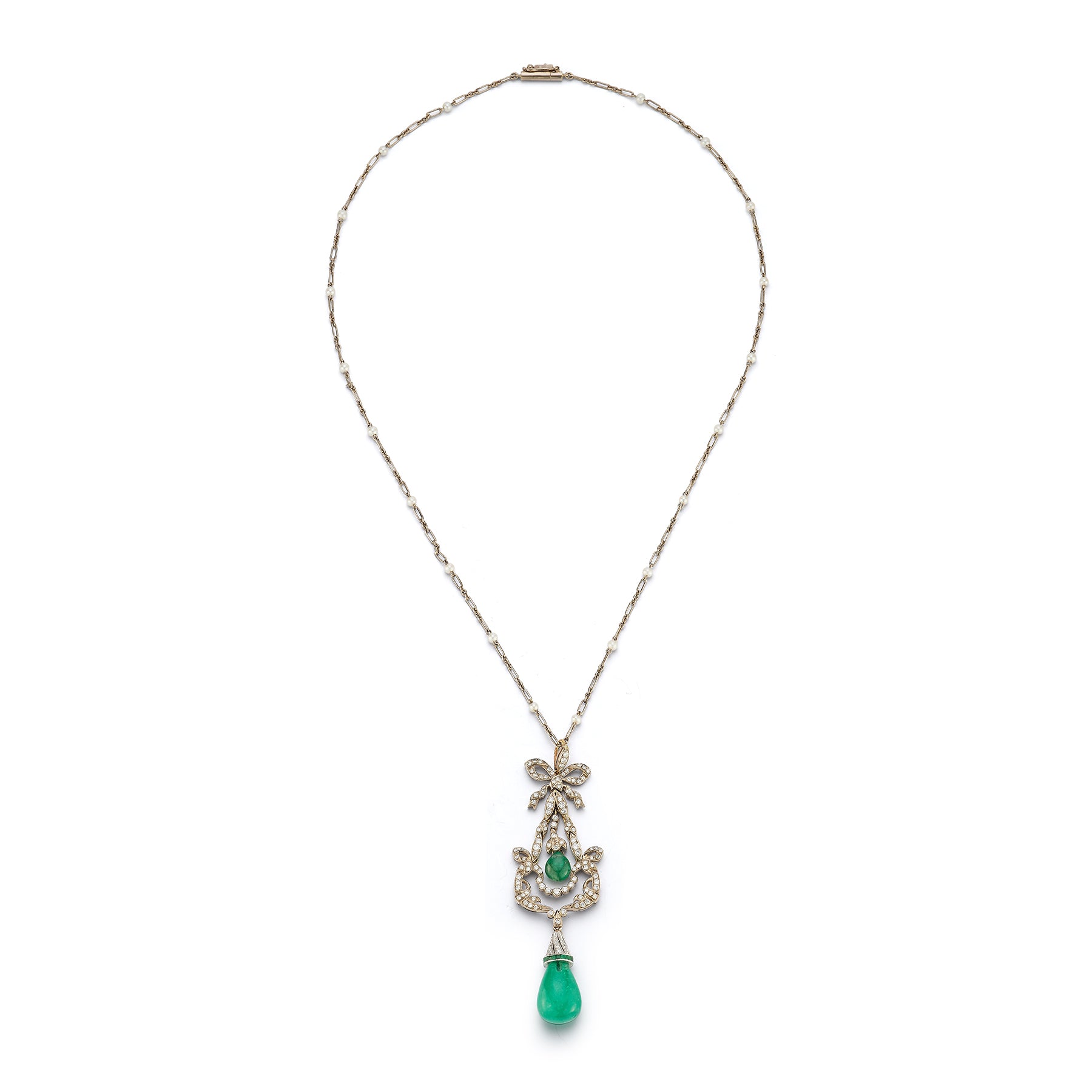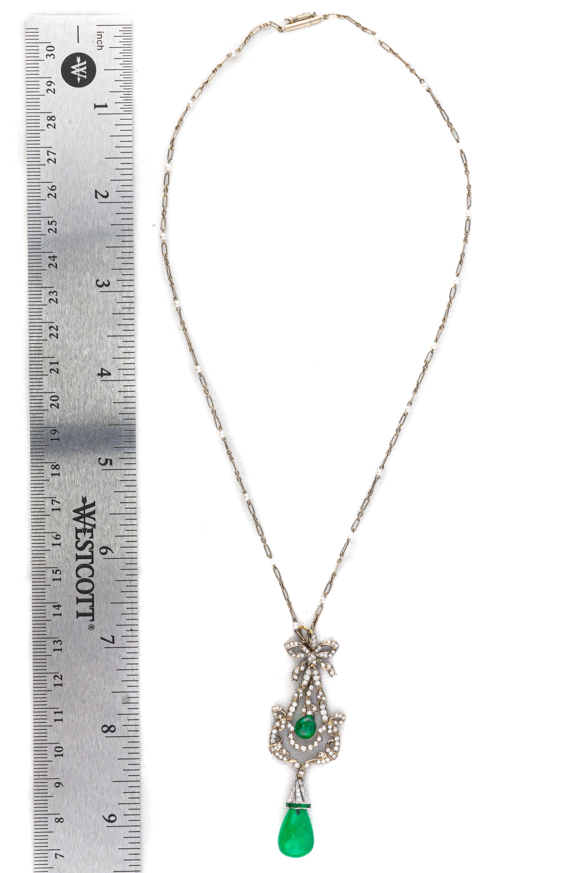 A refined pendant necklace crafted in 18 karat white gold, set with luminous diamonds, pearls, and richly hued emeralds. The pendant features a delicate bow motif suspending two cabochon emerald drops with a combined weight of approximately 18.85 carats, accented by round cut diamonds that provide a brilliant contrast to the vivid green. The pendant is suspended from an 18 karat white gold chain interspersed with 20 evenly spaced pearls, adding elegance and texture. Measuring 16.75 inches in chain length with a pendant of 2.75 x 0.75 inches, this jewel blends classical inspiration with timeless sophistication.