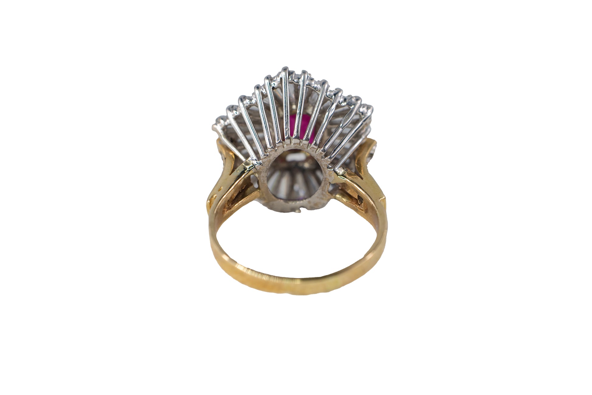 Description: This dramatic ballerina-style ring is crafted in a striking combination of yellow and white gold. At its center sits a vibrant 1.12-carat emerald-cut ruby, held securely by four prongs. The ruby is surrounded by an architectural, undulating halo of 26 tapered baguette diamonds totaling 1.65 carats, creating a fanned "tutu" effect that provides incredible light return and a high-profile silhouette.
