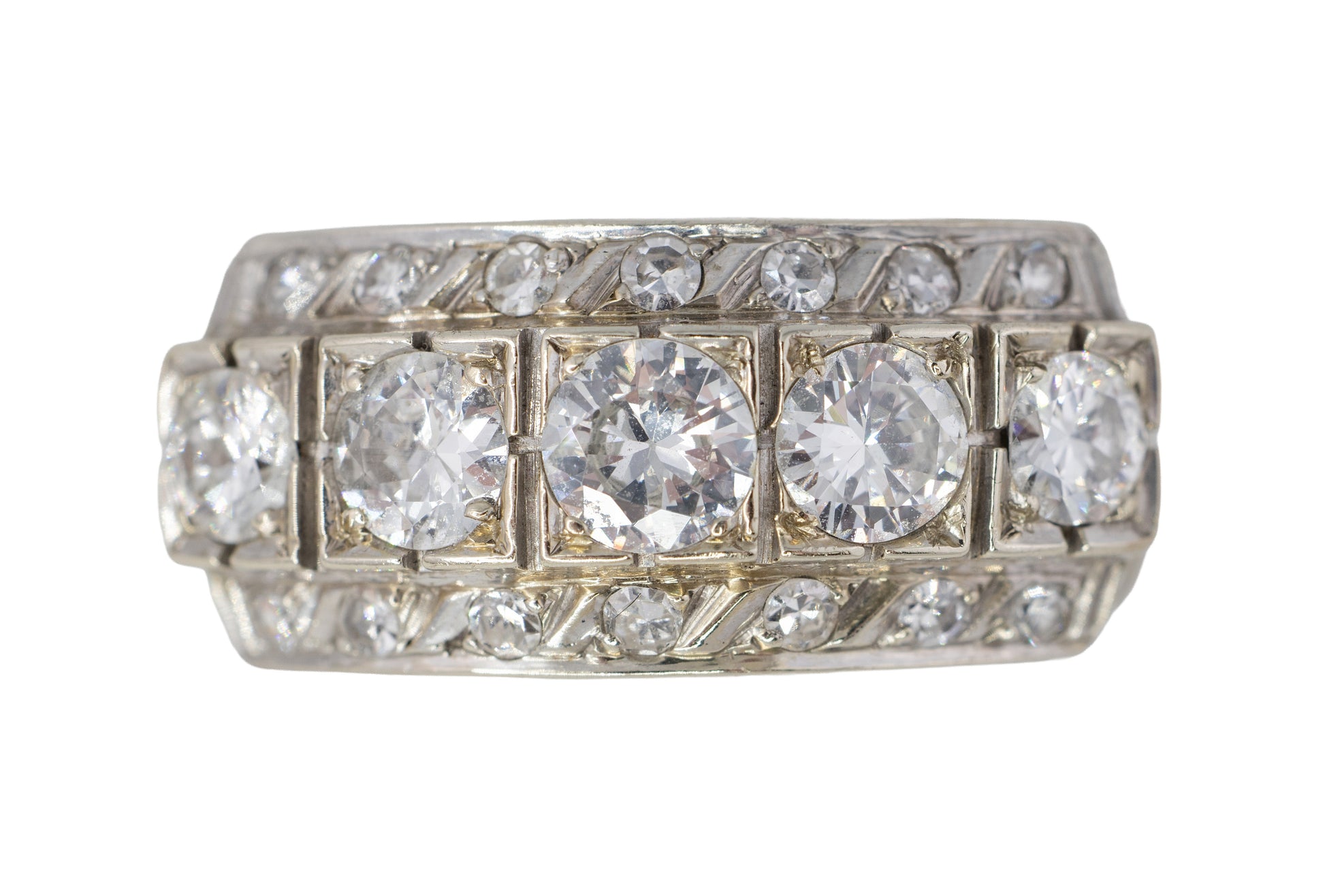 Description: This 10kt gold band features five round diamonds set in a row across the center. Each of the main diamonds is held in a square-shaped setting. The top and bottom edges of the band are lined with smaller round diamonds and have slanted engraved metalwork between them.