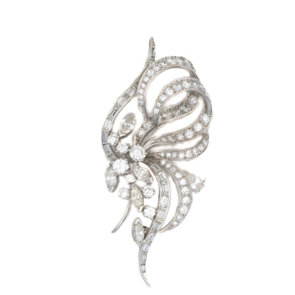 This dazzling mid-century diamond brooch features an intricate floral spray motif composed of curling platinum ribbons and layered blooms. The brooch is set with an array of brilliant-cut, marquise, and baguette diamonds arranged in a graceful composition that evokes natural movement. The contrast between the soft, organic shapes and the precise linear accents of the baguette diamonds gives the piece a sense of refined dynamism. A celebration of 1950s glamour and fine craftsmanship, this brooch is both sculptural and sparkling—an ideal statement accessory for lovers of vintage high jewelry