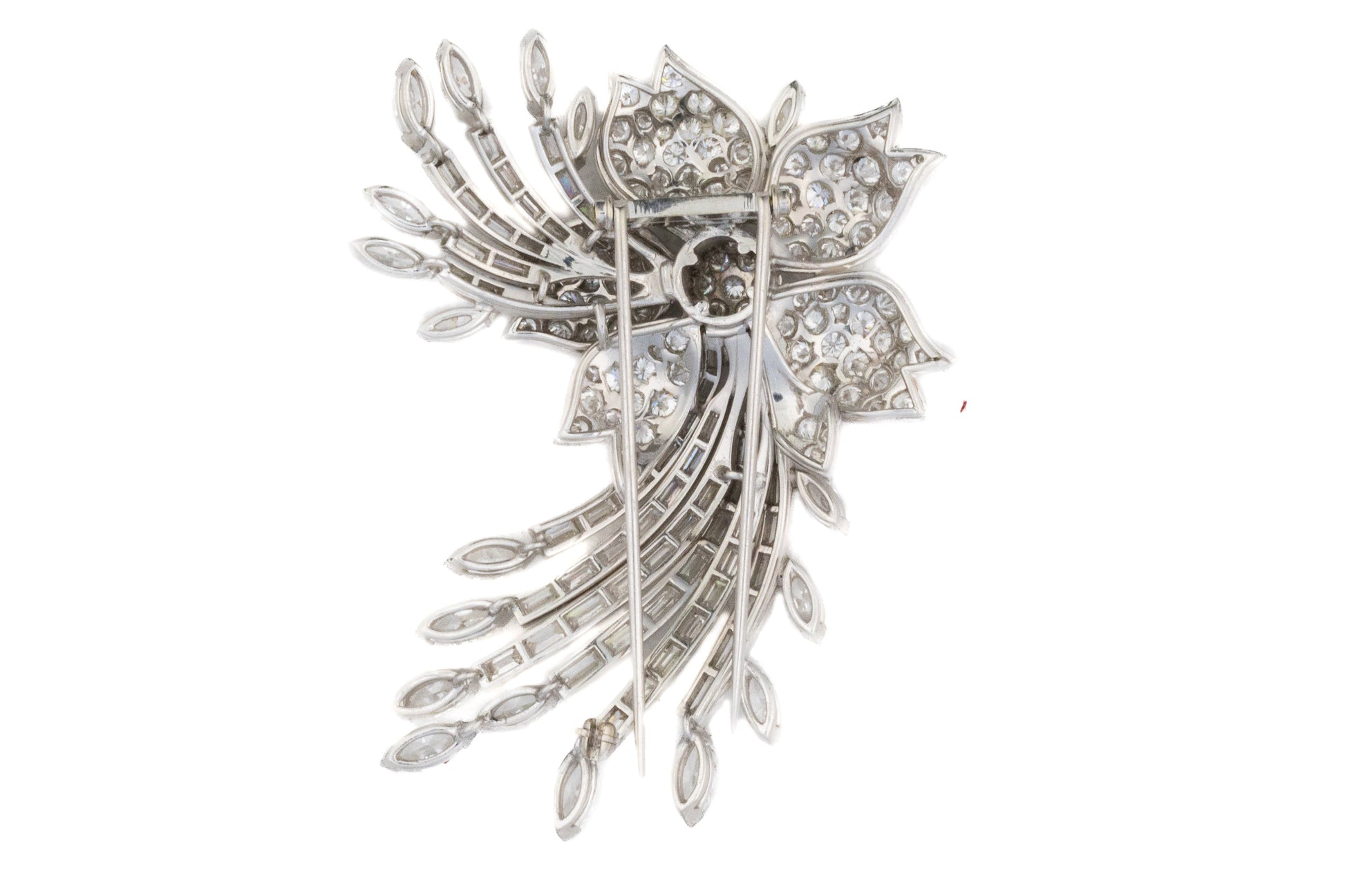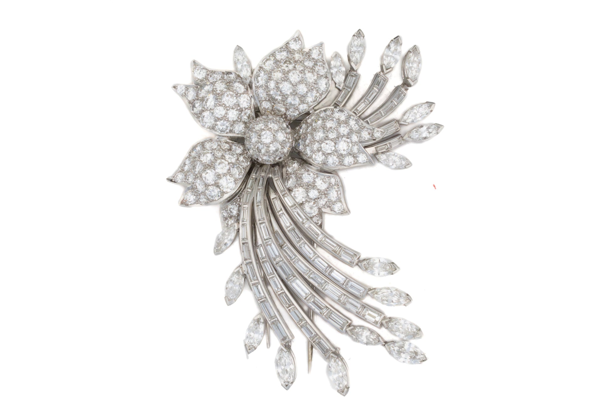 A spectacular Mid-Century diamond floral spray brooch, masterfully crafted in platinum. This intricate design features a central cluster of round brilliant diamonds pavé-set into petal-like motifs, radiating with exceptional brilliance. Graceful arcs of baguette-cut diamonds extend outward like stylized fronds, tipped with marquise-cut diamonds that add both texture and dynamic movement to the composition. The workmanship is elegant and architectural, offering a luminous interpretation of floral naturalism in classic mid-20th-century fashion. This brooch is a timeless expression of sophistication, ideal for collectors of bold yet refined vintage jewels.