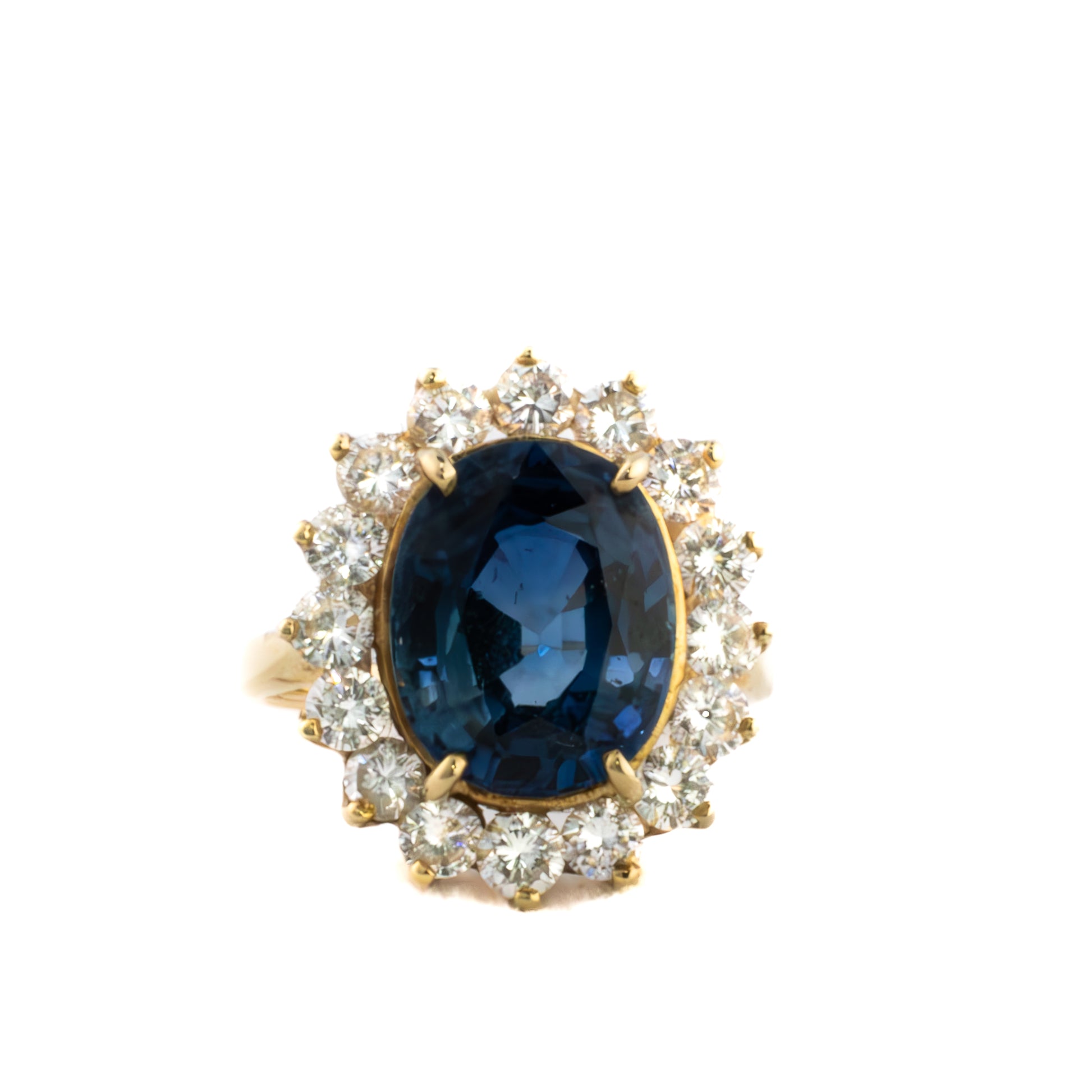 Description: A striking 14K yellow gold ring featuring an oval-cut deep blue sapphire surrounded by a radiant halo of brilliant-cut diamonds. The rich tone of the sapphire is beautifully contrasted by the bright white sparkle of the diamonds, creating a timeless and regal design. Its classic cluster setting offers elegance and balance, making it an ideal statement piece for any refined collection.
