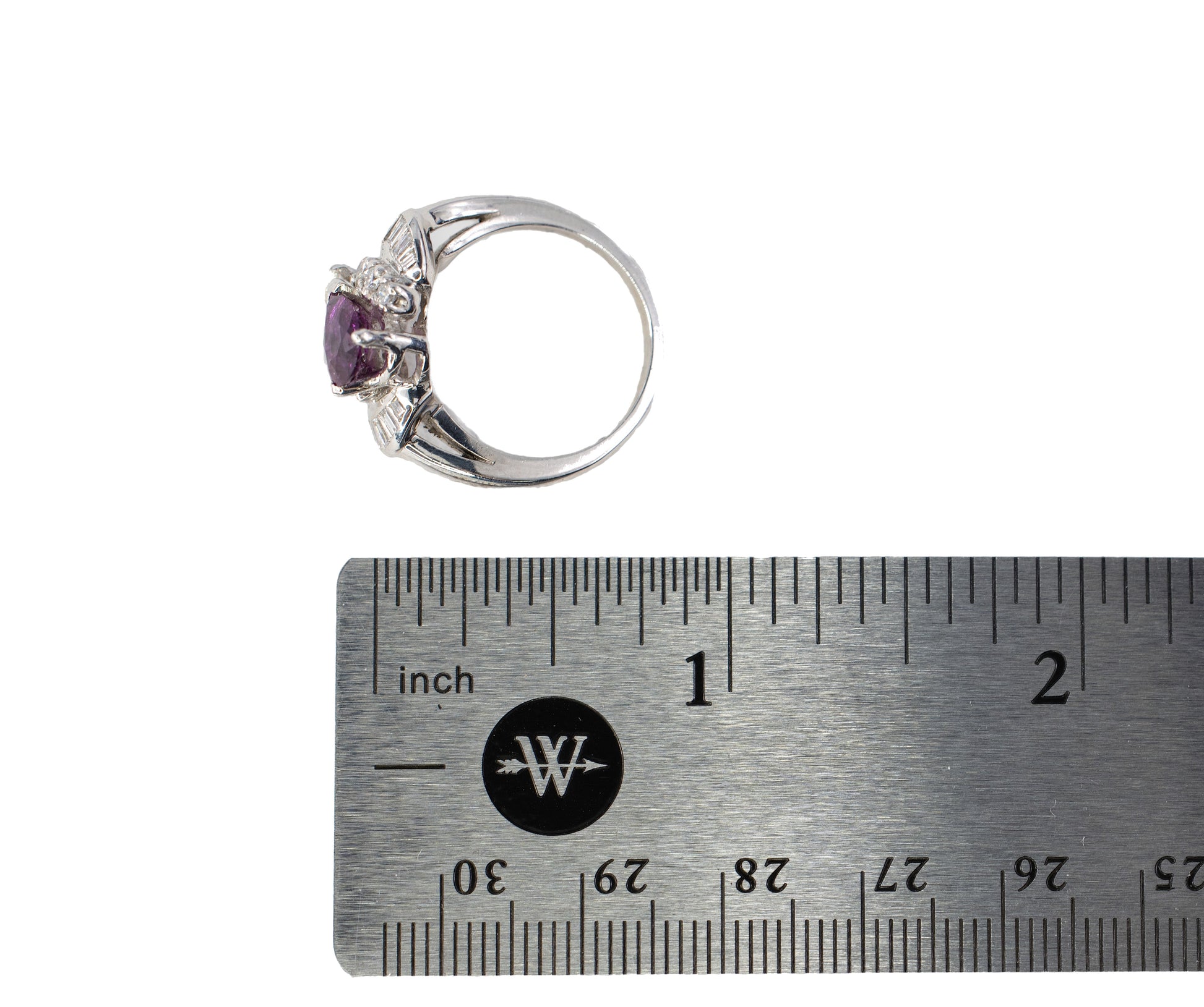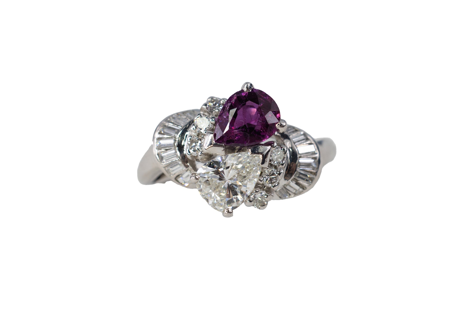 - Gemstone: Pear Cut Ruby .87CT | Pear Cut Diamond .76CT | Baguette & Brilliant Cut Diamonds .57CT