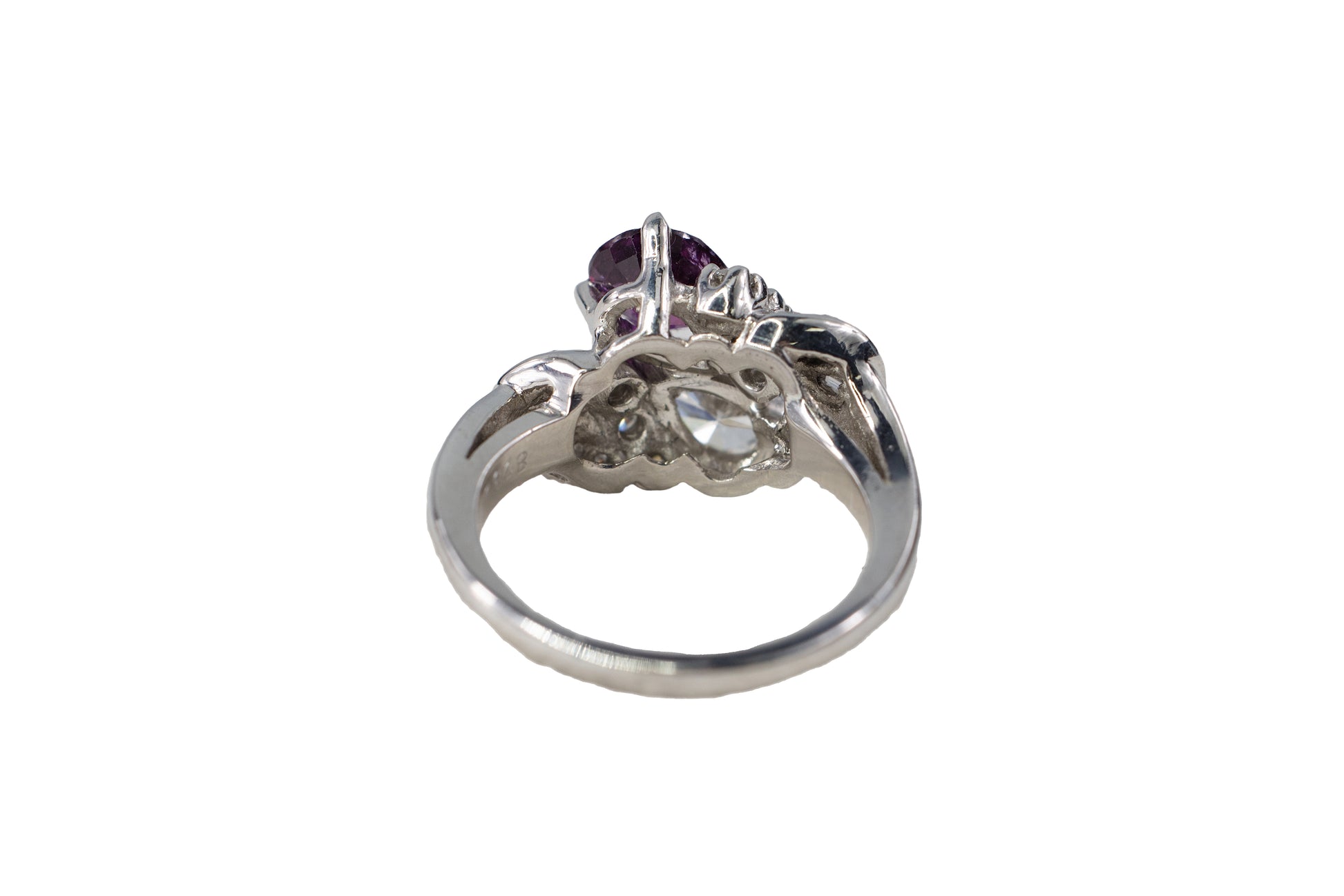 Description: This elegant bypass-style ring is crafted in platinum and features a "Toi et Moi" (You and Me) design. The center features two vibrant pear-shaped stones: one 0.87-carat ruby and one 0.76-carat white diamond. The stones are set in an opposing bypass orientation, creating a graceful, fluid silhouette on the finger.
