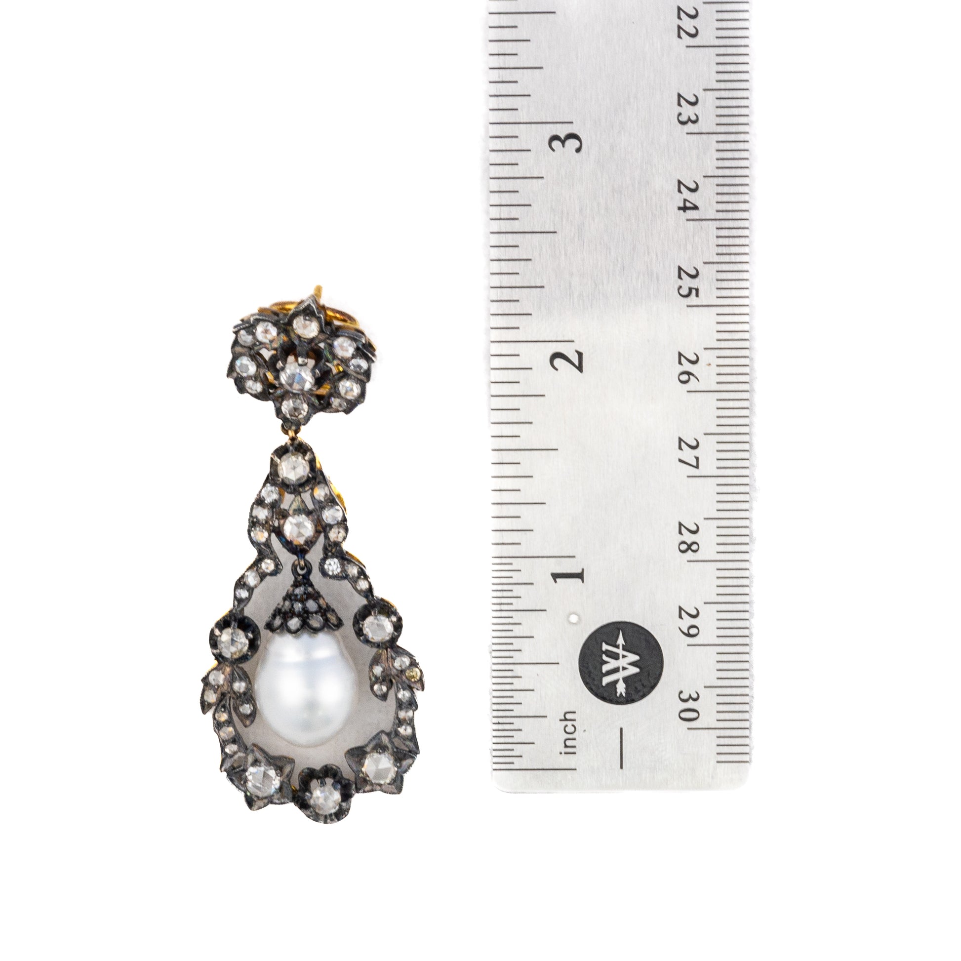 These breathtaking Pearl & Diamond Earrings are a masterful blend of sophistication and timeless beauty, crafted in 18k yellow gold and silver. Each earring features a lustrous pearl, measuring 16.8mm x 12mm and 17.5mm x 12mm, surrounded by a dazzling array of diamonds totaling approximately 7.0 carats. The rich contrast between the luminous pearls and the sparkling diamonds creates a harmonious interplay of light and texture. Designed with a clip-on post for comfortable wear, these earrings offer an air of refined elegance, making them a majestic statement piece for any formal occasion or a treasured addition to a fine jewelry collection.