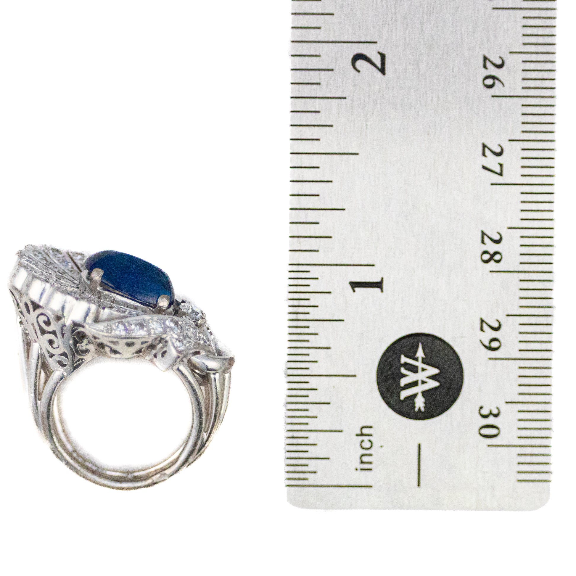 Description: A striking platinum ring featuring a rich cabochon-cut blue sapphire framed by a radiating design of brilliant-cut diamonds. The diamonds are elegantly set in sweeping, fan-like channels that enhance the sapphire’s deep luster and natural sheen. A refined piece that captures both vintage glamour and timeless sophistication.