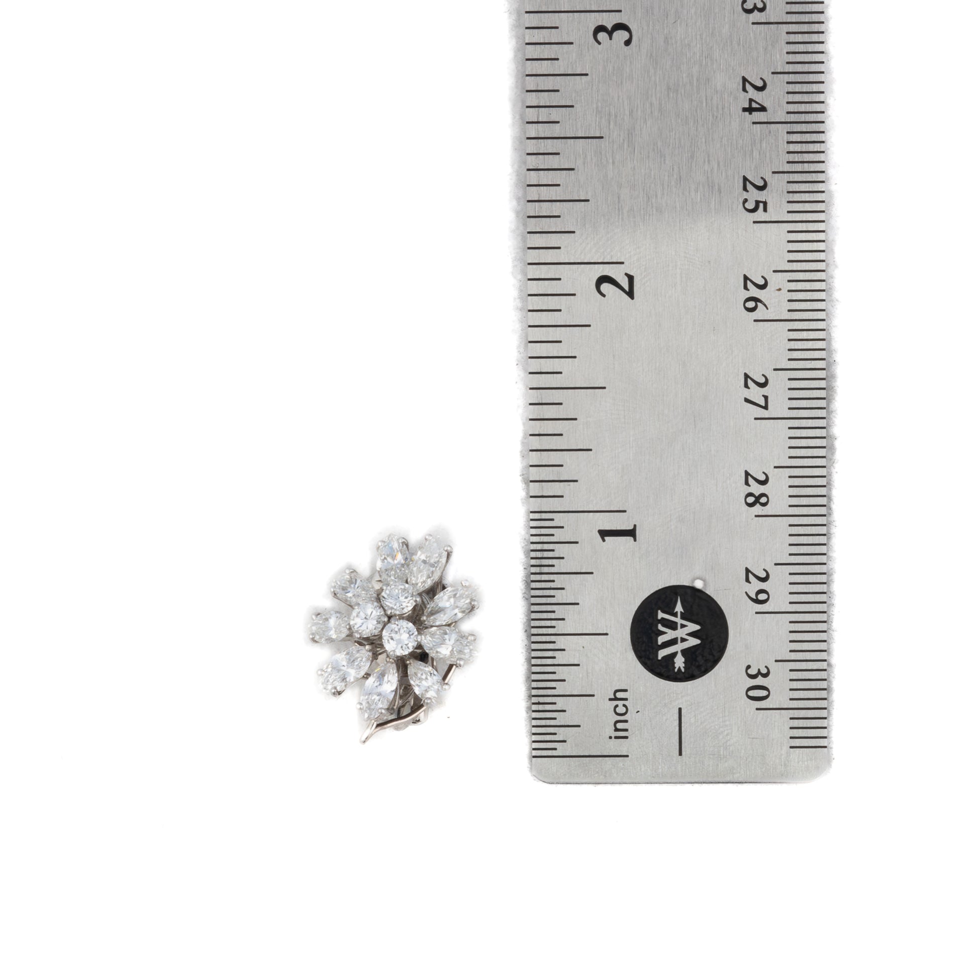 A radiant pair of platinum earrings featuring a stunning floral motif. Each earring showcases six round-cut diamonds and 18 marquise-cut diamonds, arranged in a brilliant bloom of dazzling light. With a total approximate diamond weight of 7.14 carats, these earrings bring a touch of elegance to any ensemble. Measuring 0.75 inches in length, they offer a graceful yet noticeable presence, secured with clip-on backs for comfortable wear. The intricate arrangement of diamonds resembles delicate petals, creating an exquisite sparkle that radiates from every angle, lending these earrings a truly majestic allure.