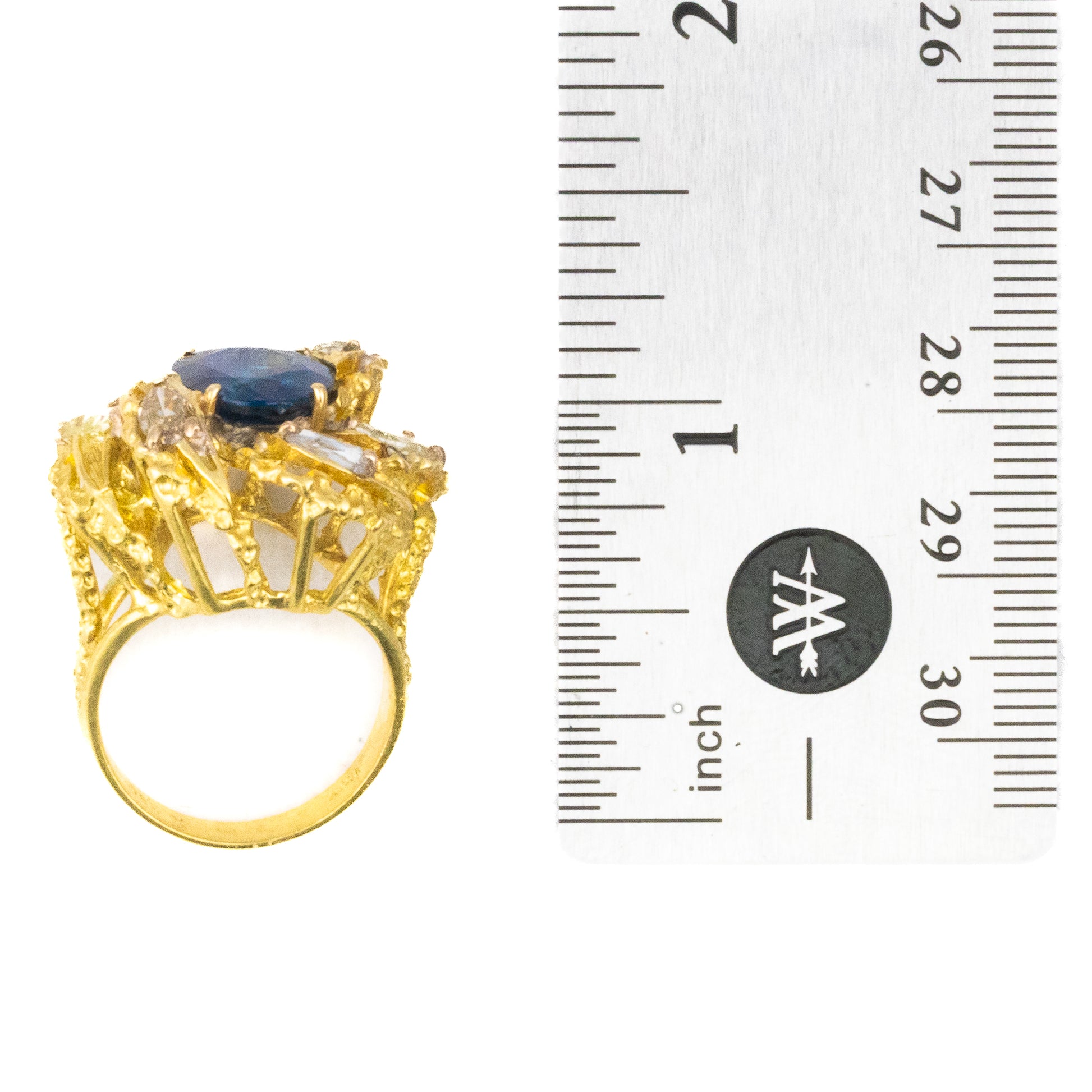 Description: A striking 14K yellow gold ring showcasing a rich oval cut blue sapphire surrounded by a unique cluster of pear and marquise cut diamonds set in textured gold. The sculptural mounting adds depth and dimension, highlighting the vibrant sapphire at the center. A bold, artistic statement piece that captures the spirit of mid-century design with timeless allure.