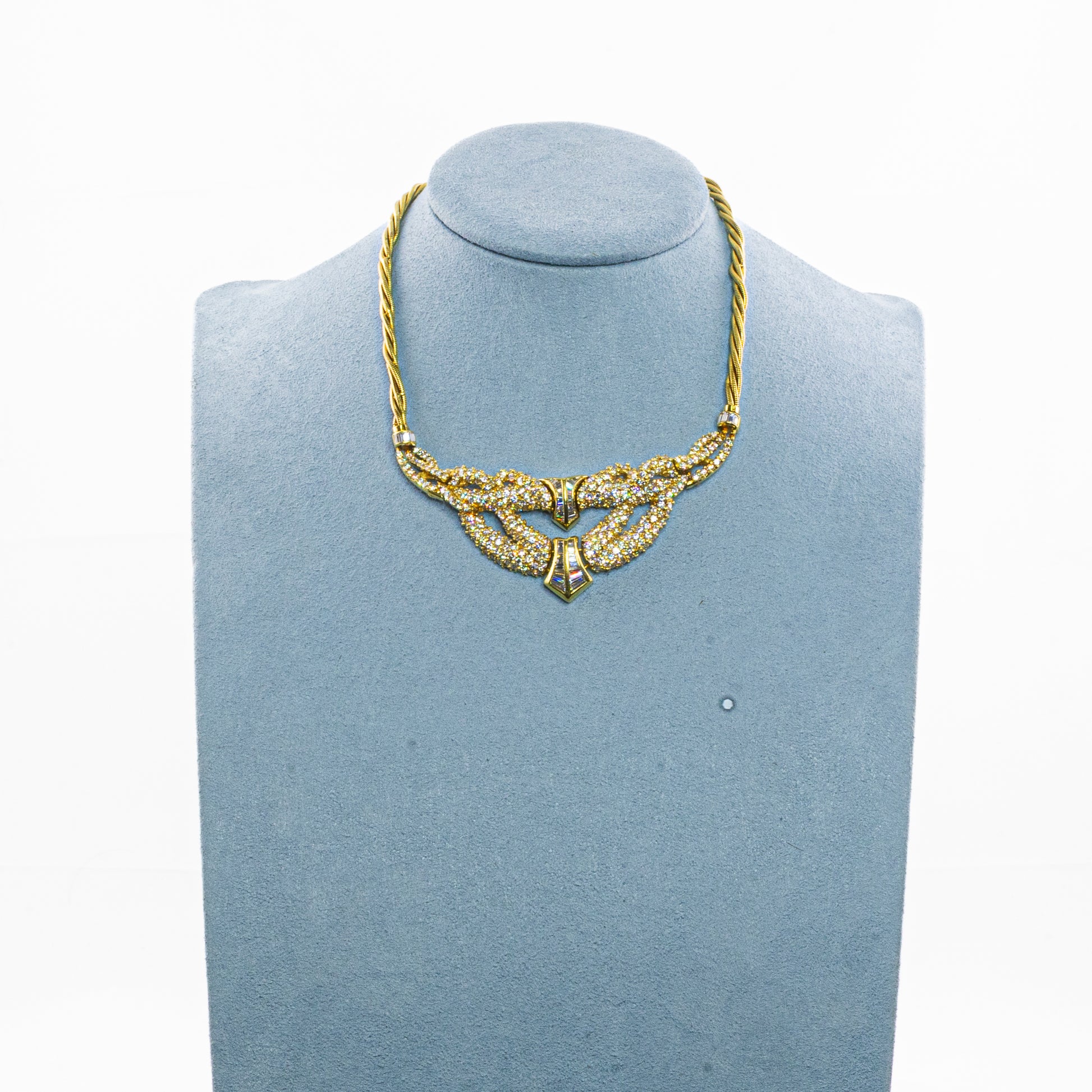 An elegant collar necklace crafted in 18 karat yellow gold, designed with a twisted chain leading to a sculptural front section set with diamonds. The centerpiece features an interlaced openwork motif pavé-set with brilliant-cut diamonds and accented by baguette-cut diamonds for a refined geometric contrast. The gold’s rich warmth enhances the brilliance of the stones, creating a necklace that is both bold and sophisticated. Resting gracefully along the collarbone, this piece embodies timeless luxury with a striking contemporary edge.
