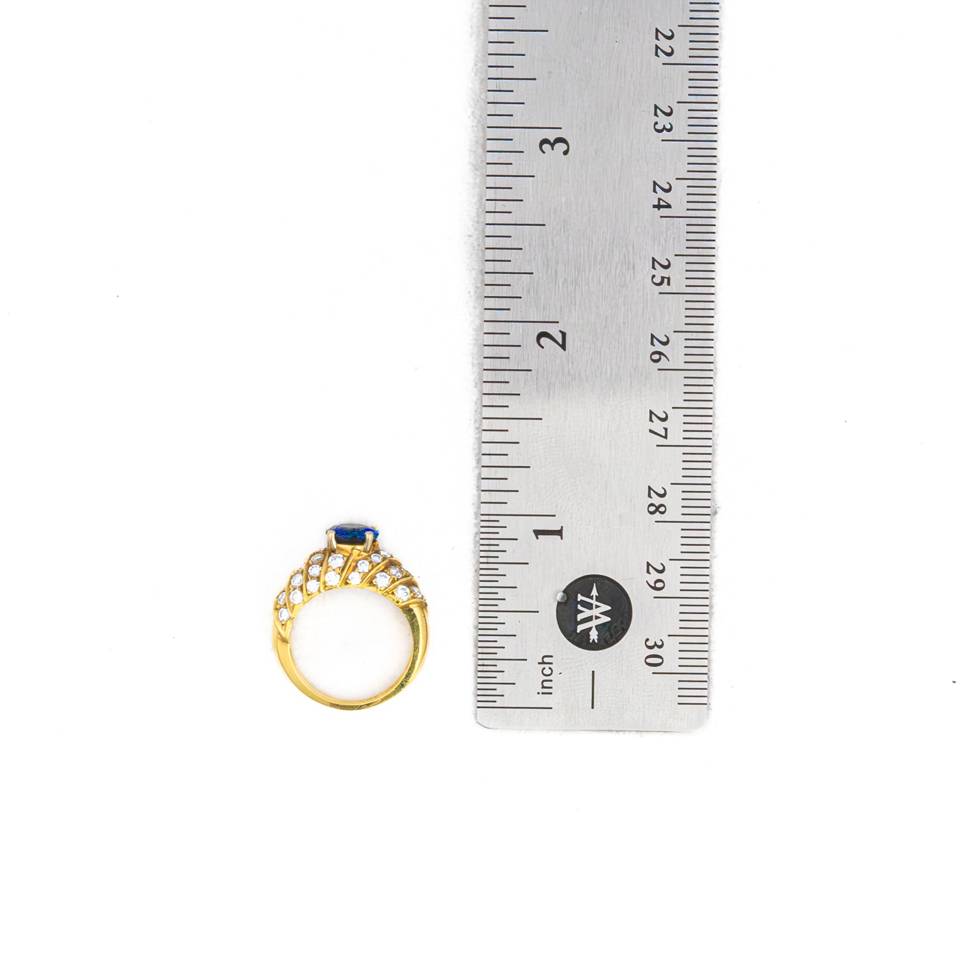 A refined 18k yellow gold ring designed with a bold central round sapphire of deep, velvety blue, beautifully complemented by a pavé of brilliant-cut diamonds set in a spiraling pattern across the shoulders. The warm yellow gold enhances the intensity of the sapphire while the diamonds add brilliance, creating a piece that is both timeless and sophisticated.