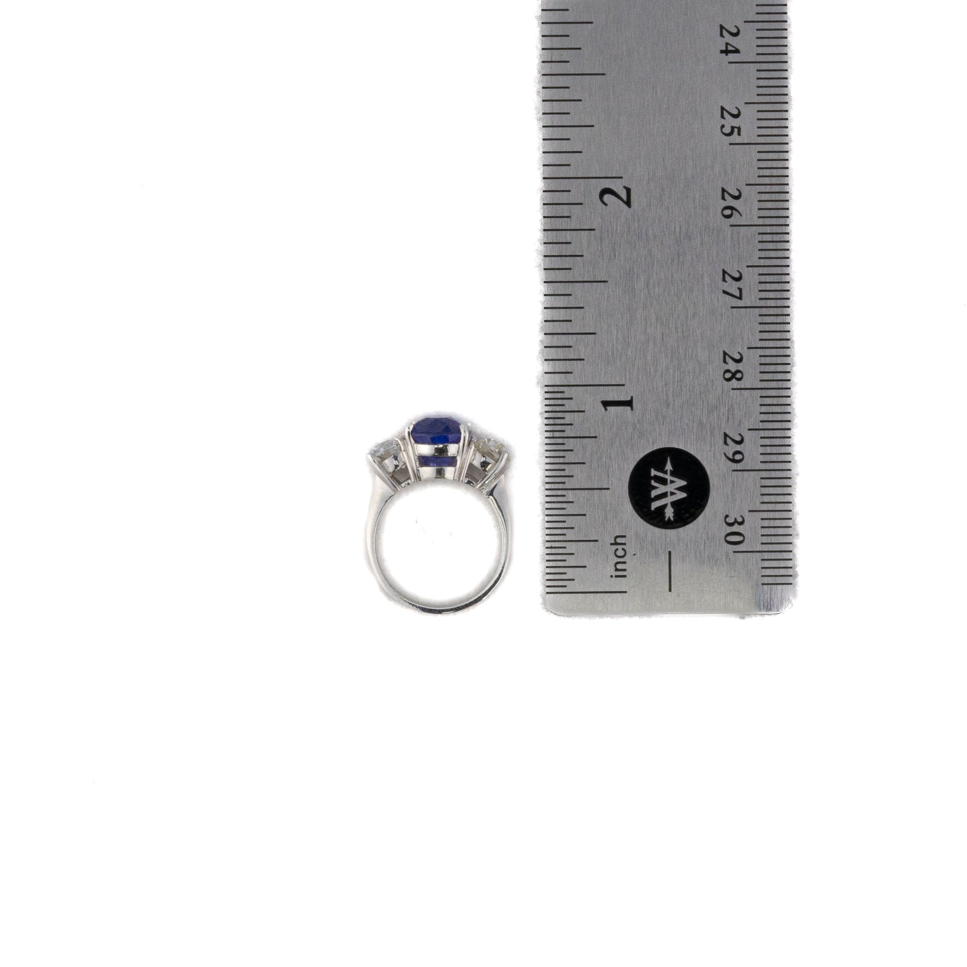 Description: A refined 14K white gold three-stone ring showcasing a vivid 3.88-carat cushion-cut sapphire of deep blue hue, flanked by two sparkling brilliant-cut diamonds totaling approximately 1.75 carats. The balanced design highlights the sapphire’s vibrant color and clarity while the side diamonds add exceptional brilliance and contrast. Elegant and timeless, this ring embodies classic sophistication and enduring beauty.