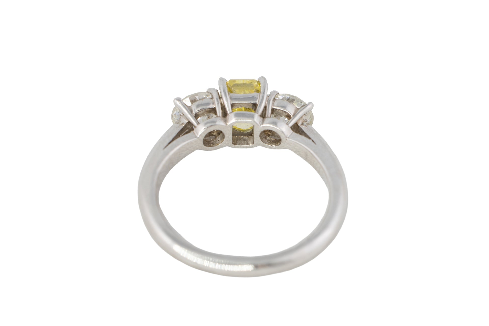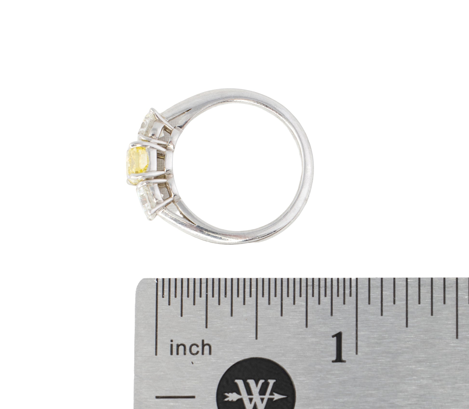 Description: This three-stone ring features a radiant-cut yellow diamond in the center. The yellow diamond is set in a platinum mounting and is flanked by two colorless round brilliant-cut diamonds.